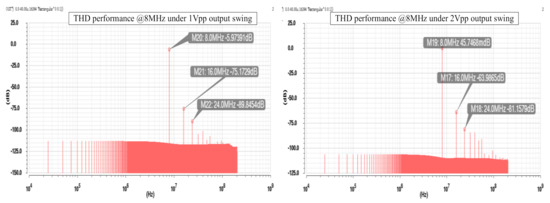 The simulation results of the total harmonic distortion of the proposed circuit under 1 V and 2 V output swing operating at 8 MHz.