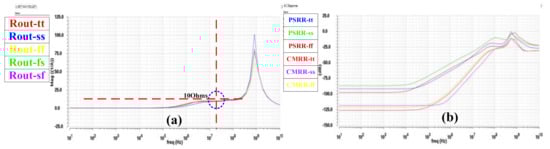 wherein is the transconductance of the last class-AB stage, which equals , is the total parasitical capacitance on FVF buffers’ output. As implied by Equation (19), can be in the GHz range when is sufficiently large, and becomes a very high-frequency pole. Finally, the frequency property of the entire circuit can be summarized in Table 1.
