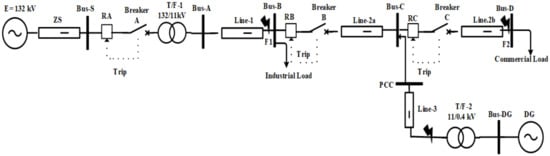 With inception of faults, the network experiences voltage sag and the Sensitive Equipment (SE) may trip if its value is higher than the immunity level []. The parameters characterizing the voltage sag are its magnitude, duration and phase angle jump. The magnitude of voltage sag depends upon the type of fault and impedance of the network while its duration and phase angle jump rely on the fault clearing time and total X/R ratio of the network, respectively []. However, installed DGs are expected to support system’s voltage during sag conditions caused by prevailing contingencies []. However, when a fault occurs on the feeder, with DG installed between the fault point and protective devices, the relay senses a reduced fault current due to high fault impedance. Making installed protection scheme more sensitive is also not a desirable effect because it results into sympathetic and false tripping of relays even for transient events or faults occurring near the adjacent networks [].