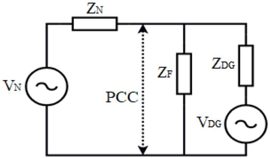 With reference to Figure 3, the magnitude of voltage sag at the point of connection (PCC) for symmetrical faults is calculated using Equation (1), with , , , representing the voltage and impedance of utility network and DG, respectively, and is the fault impedance.