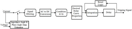 The conceptual diagram of directional over-current relay is shown in Figure 4 []. Wherein, the input signal is initially filtered out to remove harmonics and dc components from it and later it is compared with the pick-up setting of relay. If it is higher than the predefined value, a signal is processed to select the desired characteristics curve. The chosen curve is integrated, and if the value of fault current is continuously higher than pickup setting of relay and is on rising trend, a trip signal is sent to the designated circuit breaker. Conversely, if fault current is temporary or momentary, the integrator output is reset to zero using feedback from reset logic gate. In order to incorporate directional features, a switch is used to allow the current to pass through the relay based on the particular direction of power flow. The directional element in this research is implemented using information of phase angle jump together with impedance angle of system, as shown in Figure 5.