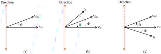 Phasor representation on estimating the direction of fault current, (a) normal operation of system, (b) forward flow of current with respect to fault location, (c) reverse current flow with respect to location of fault.