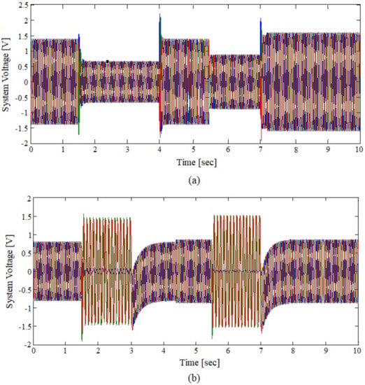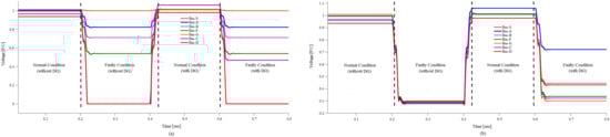 Considering the voltage sag, Figure 7 shows the voltage profile of all the system buses under normal and contingency states at different instances. Before fault, the system voltage is at nominal values (1 ) and is within the pre-defined permissible limits until 0.2 s. After 0.2 s, a three phase (symmetrical) and single line to ground (unsymmetrical) faults are injected into the system at Bus-D and Bus-B in Figure 7a,b, respectively. In the case of three phase fault, the voltages on Bus-C and Bus-D tend to zero due to the existence of short circuit path with negligible fault impedance while the other buses, especially grid Bus-S, are less effected due to the presence of significant line impedance between its intermediate buses and fault point F2. After 0.4 s, the fault is cleared by the installed relays and network returns to its normal state, with its transient behavior, eventually damped by the characteristics impedance of the network. However, at 0.4 s, a DG is integrated into the system and in its response, the voltages on all the buses have been improved and less sag is observed during the faulty condition as well. Such a scenario is simulated after s, with a notable improvement in Bus-C voltage, which was experiencing zero potential during the fault before without DG, in Figure 7a. However, for single phase to ground fault at point F1, the situation is a bit different; being near to the grid its inception impacts almost all the buses uniformly but fortunately less as compared to three phase fault, owing to the fact that the zero sequence impedance of network contributes significantly to limit the level of fault current . Similarly, after installing DG, the network conditions happen to be better not only during the normal but also during faulty states, as shown in Figure 7b.