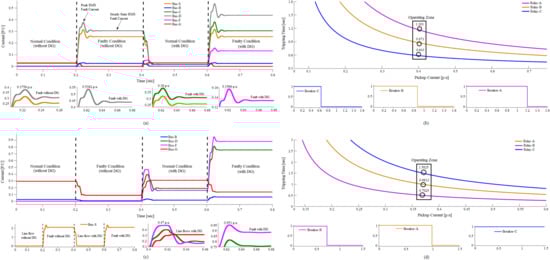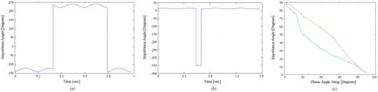 In Figure 5, three scenarios are considered. In (a), the system operates in normal condition and no fault occurs, whereas in (b), a fault occurs at downstream with the direction of current flow being same as the polarity of relay. The direction in this condition is characterized by positive impedance angle and retarding phase angle jump . While in (c), an upstream fault condition is shown where direction of current flow is opposite to the polarity of relay. The direction in this scenario is characterized by negative impedance angle and progressing phase angle jump . However, an inverse time characteristics curve is predefined for all the fault conditions in Figure 4 that is mathematically formulated using Equation (6)