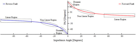 Estimation of fault current direction as a function of impedance angle and phase angle jump of the system. Dynamic region represents the instant of fault inception with the formation of short circuit path while the highly non–linear region corresponds to momentary variations into network impedance which becomes linear eventually.