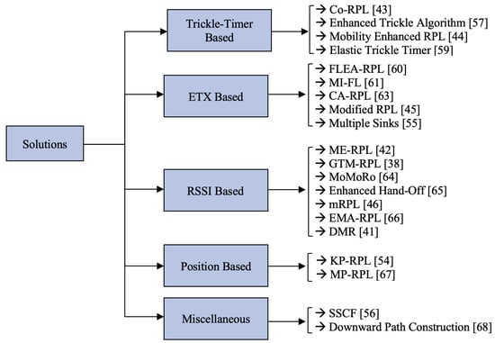 Unlike these surveys that each focus on RPL, its key components, and its shortcomings for load balancing, the issues of RPL mobility and related problems were not the main focus of these surveys. The closest to our surveys are following: Ref. [28] compares a limited number of routing protocols for LLNs and assesses the impact of mobility on the network performance; Ref. [29] studies the performance of RPL and P2P-RPL protocols; and Ref. [30] presents a survey on RPncement focusing on network topology, mobility, and security. However, compared to these works, this survey presents a qualitative methodology to present various issues faced by RPL during mobility of IoT nodes; such as lack of identification of mobile nodes, issues with Trickle algorithm loops in the network, the delay caused by Expected Transmission Count (ETX) probing, lack of positioning information, increased handoff delays, issues with the rank of detached mobile nodes and the lack of sink-to-sink coordination. We identified 20 different variations of the RPL protocol suggested in the literature and classified them into five categories based on various criteria. For example, solutions based on 1. ‘Trickle-timer’ that address various issues such as frequent changes in topology due to nodes movement, slow DIO message probing, dynamic selection of various timers, and packet loss due to selection of preferred parents. 2. The `ETX-based solutions’ that deal with enhancing link quality, such as reduced communication delay, link stability during mobility, reducing the cost of making new network topology, and slow response to topology changes due to delays in ETX probing, unreachable destinations, and loops in the network. 3. `RSSI-based solutions’ that provide mobility and energy aware routing and address handoff delays for better link quality. 4. `Position-based solutions’ that address position inaccuracies and disconnections among static and mobile nodes by providing reliable routing, address frequent topolog changes and speed of mobile nodes, and 5. Miscellaneous solutions.