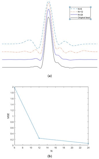 In order to find the best fit, the MMSE approximation for each is obtained, and the one with the smallest value is kept. As a result, each heartbeat is represented by a set composed of the best and the corresponding fit coefficients and it is possible to use only these parameters to perform the morphological classification of the heartbeats [3,29]. Figure 2 depicts the effect of increasing the number of Hermite function in the beat estimation. Figure 2a shows the original beat (in black) and the estimation with . It can be seen that, as long as the value of N is increased, the estimation captures the variations of the heartbeat in more detail. Figure 2b shows the decreasing trend of the minimum square error (MSE) for each estimation.