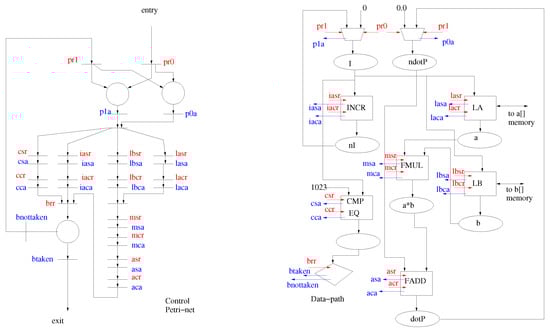 The control path in the virtual circuit encodes all of the sequencing that is necessary for correct operation of the assembly. The control path (shown on the left in Figure 3) is modelled as a Petri-net with a unique entry point and a unique exit point. The Petri-net is constructed using a set of production rules, which guarantee liveness and safeness [21]. Transitions in the Petri-net are associated with output symbols to the data-path (these can be described by the regular expressions and ) and input symbols from the data path (these are of the form and ). The symbols instruct an element in the data path to sample its inputs and the symbols instruct an element in the data path to update its outputs (all outputs of data path elements are registered). The and symbols are acknowledgements from the data path, which indicate that the corresponding requests have been served.