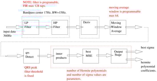- Lakhotia, K.; Caffarena, G.; Gil, A.; Márquez, D.; Abraham, O.; Desai, M. Low-Power, Low-Latency Hermite Polynomial Characterization of Heartbeats Using a Field-Programmable Gate Array. In Proceedings of the International Work-Conference on Bioinformatics and Biomedical Engineering, Granada, Spain, 7–9 April 2014; pp. 266–276. [Google Scholar]