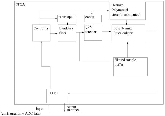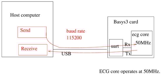 The Xilinx Artix 7 series FPGA xc7a35tcpg236 (Xilinx, San Jose, CA, USA) was used as the platform for the hardware implementation. In particular, we used the BASYS-3 FPGA board from Digilent (Pullman, WA, USA) [32]. For synthesis, we used the Xilinx Vivado 2019.4 tools. The block diagram of the test setup is shown in Figure 8. In this setup, the host computer first uses the UART to download the Hermite polynomial tables and the filter coefficients to the system. After this is performed, ADC samples are streamed to the FPGA over the UART at a baud rate of 115,200. The post Hermite fits and QRS peak locations are monitored by an application on the host computer. It must be stressed that AHIR allows for simulation of the system by using benchmarks written in C. During the simulation, it is possible to select if the simulation is using the compiled C files or if the hardware functions are simulated by means of an HDL simulator (i.e., GHDL). In both cases, the input vectors are read from files and the output vectors are stored also in files, so it is possible to check the correctness of the hardware implementation.