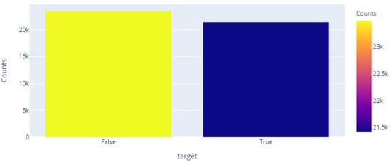 The dataset used in this study consists of fake news and real news. Each file of the dataset consists of more than twenty thousand examples of fake news and real news. The dataset considers the title, text, subject, and date that the articles were posted, and the dataset comprises information used from the fake and real news datasets used for Ahmed, Traore and Saad []. Figure 1 shows an image representing the number of fake and real news samples in the form of a bar chart.