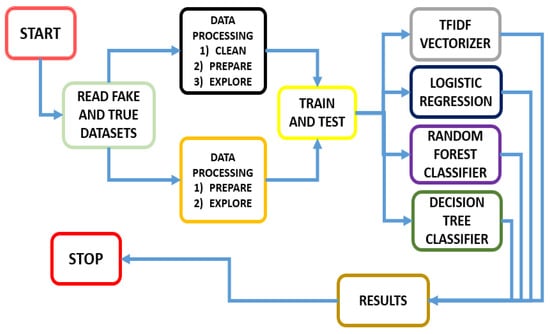 Recently, machine learning models have achieved good performance results in all fields [,,,,]. The machine learning techniques that are very useful in detecting news and marking it as fake or real are the random forest classifier technique, TF-IDF vectorizer technique, and logistic regression technique.