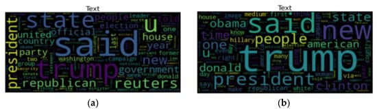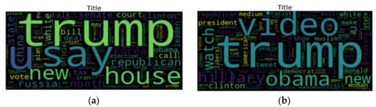 Figure 4a shows the word clouds of the keywords from the titles from the real news samples, with words such as Trump, state, republican, president, said, Reuters, and party. Figure 4b shows word clouds depicting the keywords from the titles of the fake news samples, with words such as Trump, people, and said.