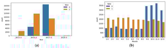 Further, we created new features, "year," which can be seen in Figure 6a, and "month" in Figure 6b, after using the date column to check which year contained more fake or real news. All of the information for the year 2015 in the dataset is fake news. The amount of fake news is higher until month 8, after which the amount of real news increases drastically. It essentially means that if the month is <=8, then the probability of the news being fake news is higher.