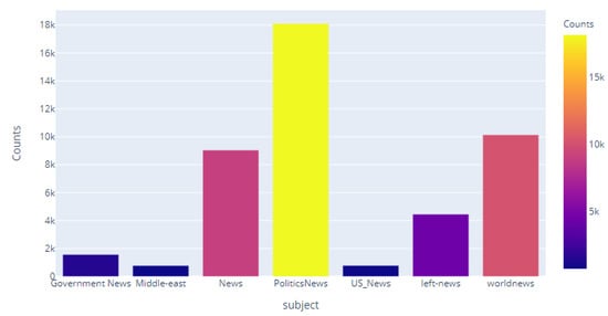 We plotted a bar chart with counts of various news subjects in Figure 7. Political and world news contained the highest counts after cleaning the dataset.