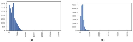 Figure 8a explores the length of the text of real news, and Figure 8b explores text length in fake news. In real news, the longest sentence is 3500, and in fake news, the longest sentence is around 7000.