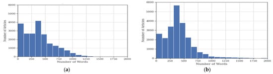 Figure 9a shows the number of articles against the number of words in real news, and Figure 9b shares the same information regarding the number of articles and the number of words for fake news articles.