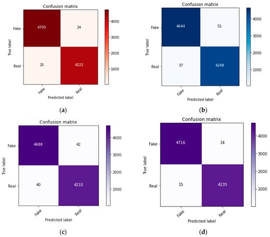 Confusion Matrix of true and predicted fake and real datasets: (a) confusion matrix of the TF-IDF vectorizer model; (b) confusion matrix of the logistic regression model; (c) confusion matrix of the random forest model; (d) confusion matrix of the decision tree model.