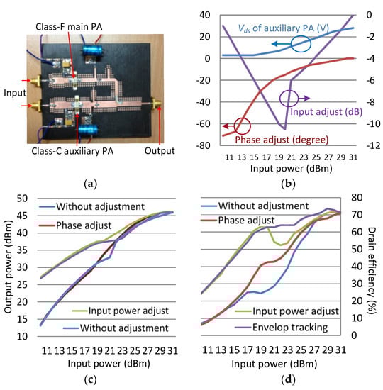 The photograph of the presented DPA is shown in Figure 5a. The inputs of the main and auxiliary PAs are independent in order for a more detailed measurement of the phase and the power ratio variation effect to search for the maximum efficiency. The optimum phase shift, the input power adjustment, and the Vds of the auxiliary PA are depicted according to the input power level in Figure 5b, in order to obtain the efficiency enhancement. In this figure, the phase difference and the power ratio at the maximum output condition is termed as the reference point.