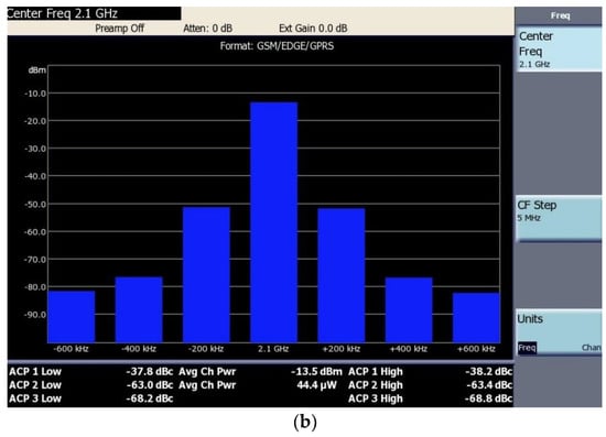 The third-order intermodulation (IM3) is measured at an input power of 30 dBm (1 dB’s back-off from saturation point, corresponding to a single tone of 27 dBm, with 5 MHz interval). The IM3 is better than 19.88 dBc, which shows a very good linearity result. Furthermore, the adjacent channel power ratio (ACPR) is measured at the condition of the envelop peaking power at the saturation point (input power of 31 dBm). The input EDGE signal has a 200 KHz channel bandwidth and a 3.6 dB peak-to-average power ratio (PAPR). An ACPR of −37.8 dBc has been measured at 2.1 GHz. The IM3 and ACPR are summarized in Table 1 and displayed in Figure 7.