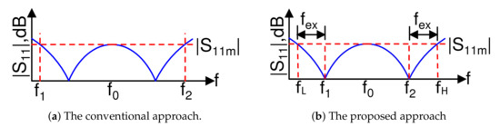 The conventional multi-section WPD was designed by using the theory reported in [3], which is a fully analytical technique applied only to a two-section WPD. For three or more sections, the reported technique is actually a table-based design and is therefore less computer-friendly. In addition, for this conventional design for a bandwidth, BW = , the reflection profile appears as the one shown in Figure 1a, with being the mid-band frequency and is the minimum return-loss in dB. In this paper, a fully analytical design approach is presented for a three-section WPD that can be easily implemented using a computational tool, such as MATLAB/Octave. In addition, as depicted in Figure 1b, the proposed design methodology utilizes a dual-band design concept [7] to arrive at a wideband design. This dual-band design approach guarantees that the resonance frequencies are always located at and , and therefore, the achieved BW , where is the extra bandwidth that provides a margin for process/component variations. This approach is the usual choice for a commercial development setup, where the minimum bandwidth requirement will always be met, and will allow flexibility to meet design goal requirements.