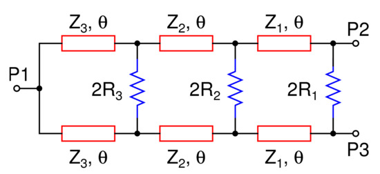 The classic three-section 3 dB WPD is depicted in Figure 2. P1 refers to the input port, whereas P2 and P3 are the two output ports. Each port has a termination impedance of . Further, , , and are the characteristic impedances of three transmission lines, while refers to their electrical length. Finally, , , and are the isolation resistors connected as shown in the Figure. Since the structure is fully symmetric about a horizontal axis passing through P1, the widely known even-odd mode analysis technique is utilized to perform its analysis.