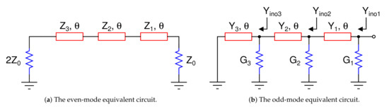 The even-mode equivalent circuit is shown in Figure 3a which has been obtained after bisecting the network of Figure 2. In the even mode excitation, two equal voltage generators with the same polarity are connected to P2 and P3, hence no current flows through the resistors, and thus the plane of symmetry becomes a virtual open. It is apparent that this equivalent circuit is in fact a special case of multi-section commensurate transmission lines discussed in [7]. To formulate the expression of and , we can refer to similar equations as shown in [7], which were derived for the three-section transmission line. Now, by considering a source impedance of and a load impedance of , we can obtain the following: