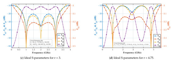 Utilizing the above-mentioned design methodology, the simulated results of a few design examples are shown in Figure 4, and the resulting numerical values of the important parameters are listed in Table 1. It is apparent from Figure 4 and Table 1 that the proposed WPD can be theoretically designed for a frequency ratio () in the range of 1–4.75 considering a 10 dB reference for the return loss and isolation parameters. However, since an additional bandwidth can be obtained in the proposed scheme, as explained earlier with the help of Figure 1b, the maximum frequency ratio () is equal to 12, which is equivalent to a fractional bandwidth.
