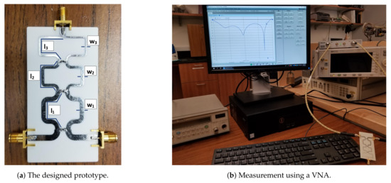 The proposed analytical design methodology is used to calculate the design parameters of a three-section WPD with 1 GHz, GHz, dB, and dB as an example. The calculated ideal design parameters using MATLAB are found to be as follows: . Subsequently, these values are used to implement and optimize the WPD in microstrip technology using a Cadence AWR design environment. All these values are optimized to balance the effects of junction discontinuity and component parasitics. The optimized design parameters are listed in Figure 5. The Roger’s RO4003C substrate parameters are as follows: , substrate height = 1.524 mm, and copper cladding = 1 oz/1 oz. The fabricated prototype is depicted in Figure 5a, whereas the measurement setup is shown in Figure 5b.