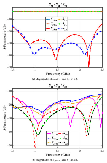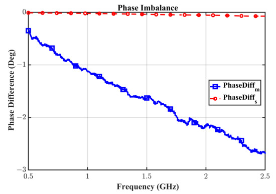 It is apparent from Figure 6a,b that the designed prototype has excellent transmission parameters maintaining an insertion-loss of lesser than dB (not very far from the ideal 3 dB value) throughout the band from 0.635 GHz to 2 GHz. A clear frequency shift is evident for the return-loss parameter , and its value is still better than 16 dB in the band from 0.635 GHz to 2 GHz, thanks to the over-design guaranteed by the proposed technique. There is some mismatch between the simulated and measured EM values which normally occur in any high-frequency design. In our case, it was possibly due to the Panasonic isolation resistor non-idealities at high frequencies. Unfortunately, the model of these resistors is not available, so it is not possible to include their impact in the simulation. Another potential reason for the mismatch can be the fabrication errors originating from limited milling accuracy. Nevertheless, the measured results show an outstanding performance of the proposed WPD, as it meets all the goals that a practical WPD will be required to meet during their deployment in the field, and we therefore accepted this result. Specifically, the measured isolation is excellent throughout the band with a minimum value of 22.7 dB. The measured phase imbalance is decent, remaining within 3 degrees, as shown in Figure 7.
