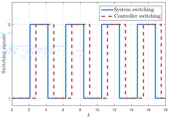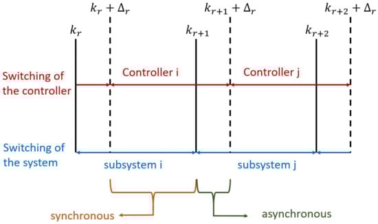 It is known that, in many practical processes, a delay, called as a lag time, can occur between system modes and controller. Therefore, a mismatch between controller and switching subsystems instances, called asynchronous switching, is present. Thus, the following controller was considered: