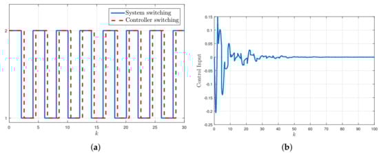 Given the initial conditions , the simulation results are depicted in Figure 7 and Figure 8. The evolutions of the system states are shown in Figure 8. Figure 7 shows the evolution of the control input and the switching rule of the controller and the system in case I.