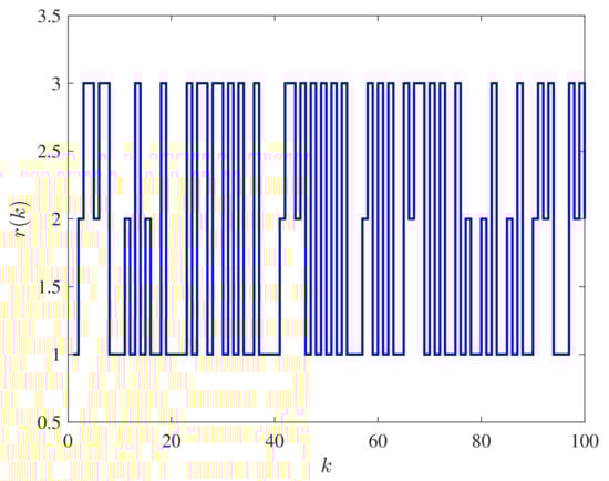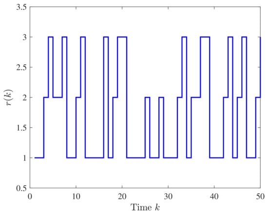 We use Matlab 2019b Yalmip toolbox to solve the filtering problem (22) and (23) with a given robust performance index . Figure 2, Figure 3, Figure 4 and Figure 5 show the corresponding simulation results. Figure 2 shows a possible evolution of Markov chain. Figure 3 presents a comparison of quantified and non-quantified measurements in case 2 and Figure 4 shows the output estimation from the distributed filtering network. Figure 5 shows the evolution of root-mean-square error of the filter in four different state transition probability matrices, which implies that the developed distributed filter can be applied to two cases, that is, the state transition probability matrix is totally known and partially unknown.