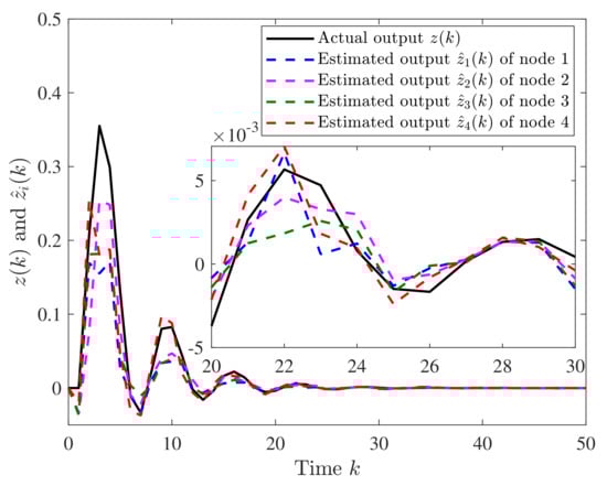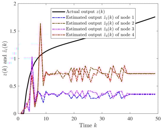 In addition, assume that , the disturbance input and measurement noise and the other parameters are the same as in Example 1.
