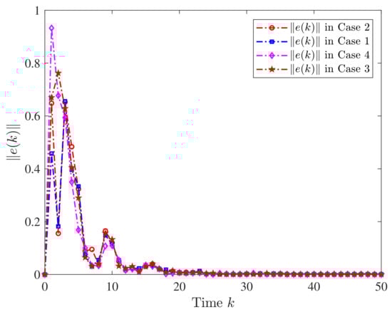 With the two simulation examples above, we have demonstrated the effectiveness of the developed distributed robust filter. However, there are still some limitations to this distributed estimator design method. For example, we reselect the external disturbance as and keep the other system parameters the same as in simulation Example 2. By solving the filtering problem (22) and (23) with a given robust performance index , we obtained the following corresponding distributed estimator gains for the Case 4.