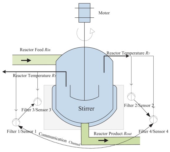 In this example, the developed distributed filtering approach is applied to address the state estimation problem for a continuously stirred tank reactor. Considering this reactor, a motor-driven stirrer can stir the reactor feed and then obtain the reactor product at the reactor bottom. The concentration of the reactor product plays a key role in obtaining the desired product and should be monitored at all times. Although concentration monitoring can be achieved using traditional chemical measurement analysis methods, using such direct measurements can increase the cost. One solution is to estimate the reactor product concentration by using the proposed distributed state estimation method, which is achieved by collecting the reactor temperature through the four sensors placed at different locations, as shown in Figure 6.