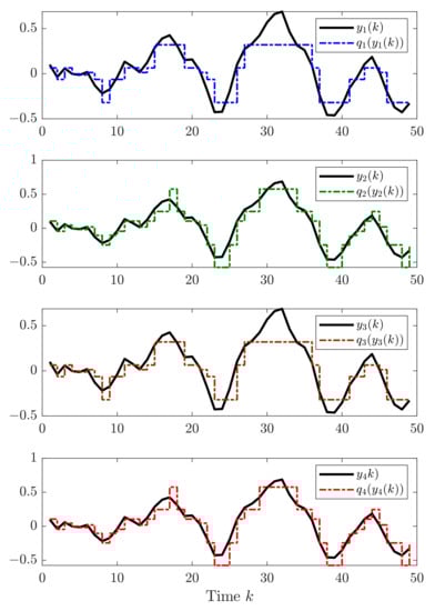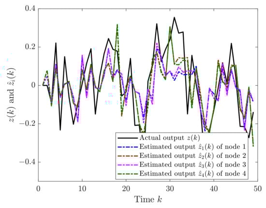 Similarly, Figure 10 presents a comparison of quantified and non-quantified measurements at sensor nodes. Figure 11 shows the actual output of the system and the estimation of filter nodes. According to Figure 11, it can be seen that the distributed filters cannot track the state trajectory of the system well. This is owing to the fact that the state response trajectory of the plant is relatively “flat” and the quantization density of the quantizer used is too small. As a result, the quantized signal does not reflect the actual sensor measurement signal well, leading to undesirable estimation results. On the other hand, our distributed filter design method cannot deal with the fact that the elements of a certain row in the transition probability matrix are totally unknown. In other words, our method implicitly requires that there is at least one known probability element in each row of the transition probability matrix. Furthermore, the distributed robust filter developed in this paper can only be applied to the state estimation for linear systems, and our distributed filtering algorithm may be invalid when there are stochastic non-linearities, time lags, etc., in the system.