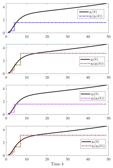 In this paper, a logarithmic quantizer is used to quantify the sensor measurement. represents the quantified measurement of sensor node i, and satisfies . Then, a logarithmic quantizer is explicitly defined as