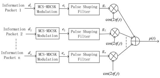 A feasible block diagram of the MC-MDCSK-MCS transmitter is given in Figure 2. In Figure 3, the structure of MCS-MDCSK modulation is presented. Bits with the information are split into n parallel parts, , and the length of each information packet is N. Each parallel information packet is transmitted via MCS-MDCSK modulation. The modulated MCS-MDCSK signal for the ith packet is presented as follows [14]: