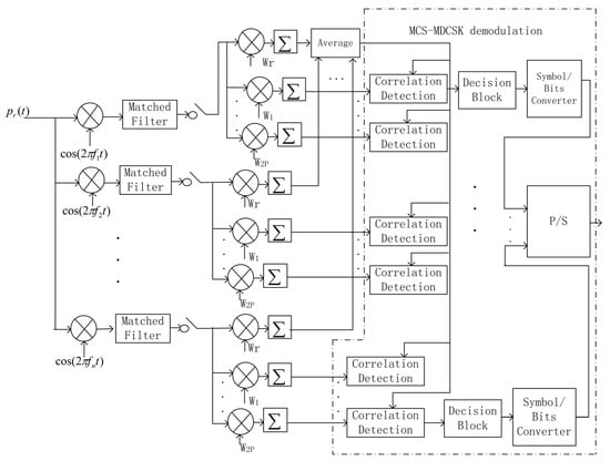 The MC-MDCSK-MCS receiver’s block diagram is shown in Figure 4. First, , the received signal, is multiplied with the synchronized in-phase carriers. Then, the resultant signals are processed by matched filters and a sampler to obtain the recovered baseband signals. Received reference copies recovered from n subcarriers are collected and then averaged by the average block for noise smoothing. The obtained averaged reference signal are utilized for MCS-MDCSK demodulation. Correlation detection is carried between the averaged reference sequence and each estimated data sequence. Lastly, the resultant sequences experience the P/S block—a mode converter of a parallel mode to a serial mode—to recover the initial information packet.