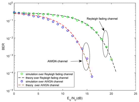 In Figure 5, the comparison between the simulation results and the theoretical results over the AWGN channel and the Rayleigh fading channel is shown. The main characteristics include M = 16, , , and . Here, we consider a three-path Rayleigh fading channel with and the time delay . Obviously, the simulation results agree with the theoretical results of the two channels.