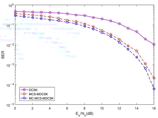 In Figure 6, the performances among MCS-MDCSK in [14], DCSK in [31], and the proposed systems are compared over the AWGN channel. All simulation results are obtained based on MATLAB R2016a. For all systems, the length of the chaotic signal is set as . In the proposed system and the MCS-MDCSK system, the length of the Walsh code sequence is 512, and the number of bits per symbol is set to 4, that is, M = 16. In the proposed MC-MDCSK-MCS system, the number of subcarriers is , and the fractional order of the Chen chaos system is . In Figure 6, it can be observed that MC-MDCSK-MCS shows better performance.