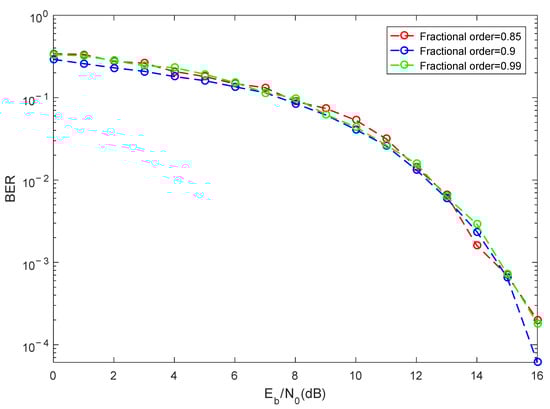 In Figure 7, to show the comparison of the MC-MDCSK-MCS system given three fractional orders over the AWGN channel, BER performances are plotted with M = 16, , and . Clearly, it can be noticed that the impact of the fractional order is negligible. Fortunately, the confidentiality of MC-MDCSK-MCS system improves with the fractional order as the range of fractional orders is extensive.