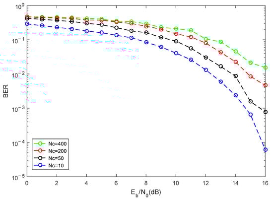 In Figure 8, to show the comparison of the MC-MDCSK-MCS system given four over the AWGN channel, BER performances are plotted with M = 16, , and . Clearly, it can be observed that MC-MDCSK-MCS shows a little better performance when the length of fractional-order chaotic signal is smaller.