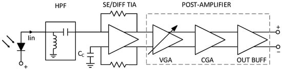 Figure 2 shows a block diagram of the proposed TIA. It consists of an input high-pass filter (HPF) followed by a TIA stage, which also performs single-ended to differential conversion. A differential post-amplifier is included to provide additional gain, featuring a variable gain amplifier (VGA), a constant gain amplifier (CGA), and an output buffer. The different blocks are described in the following sections.