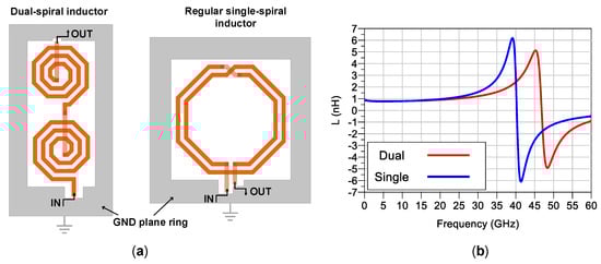 In order to achieve this relatively low cut-off frequency, spiral inductors having a large inductance value are required, which in turn leads to large physical size and low self-resonance frequency (SRF). To provide a compact layout and extend the SRF, the inductors for the HPF were implemented as series inductors with opposite winding. Figure 3a shows a representation of such a dual-spiral inductor together with a typical single-spiral inductor design, both at the same scale. To compare the two approaches, an electromagnetic (EM) simulation for both designs was performed. The inductors are designed to have the same inductance value while keeping the same design parameters in both cases, that is, the same metal layer configuration, trace width, trace spacing, distance to the ground plane ring, and ground ring width. The plot in Figure 3b shows that a higher SRF can be achieved with the dual-spiral configuration for a given inductance value, while featuring a more compact layout.