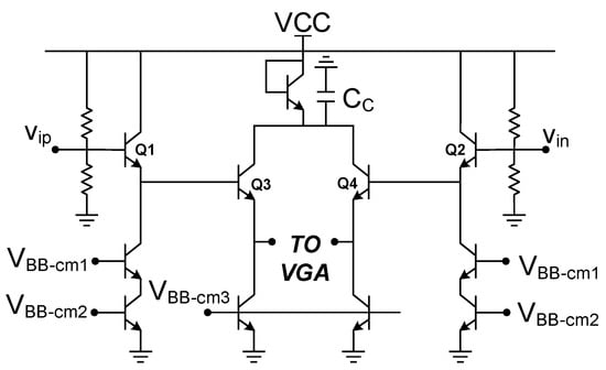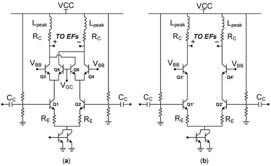 Figure 6 shows the schematic circuit for the VGA and CGA stages. The VGA, represented in Figure 6a, is implemented as a Gilbert cell, where the offset voltage for the center transistor pair in the switching quad (transistors Q5–Q6) is used to control the gain. Emitter degeneration in the bottom transistor pair (Q1–Q2) is used to linearize the response while providing increased input impedance. Values for the collector resistor RC and emitter resistor RE are 174 and 35 , respectively. The tail current source for the bottom pair is implemented with a current mirror providing bias current of 1.4 mA per finger to the active devices (Q1–Q4 when Q5–Q6 are switched off), with all transistors in the stage being two finger devices. The CGA, shown in Figure 6b, follows the same topology, where the center transistor pair from the switching quad is simply removed, leaving out a standard cascode amplifier. Due to both stages featuring a high output impedance, and together with the high input impedance of the inter-stage EF buffers, the top collector for both stages remains a high impedance node. The relatively small parasitic capacitance contributions from the different components, as well as the associated layout interconnects, can thus impose significant bandwidth limitations at this node. To compensate for this effect, shunt inductive peaking is used at the top collector nodes in both stages, provided by inductor LC with an inductance value of 0.22 nH obtained from EM simulation. This helps with speeding up the critical nodes, effectively overcoming the bandwidth limitations. As can be observed in the different subcircuit schematics, AC coupling is used at different nodes throughout the circuit. The use of AC coupling, enabled by the bandpass characteristic of the TIA, is preferred since it can provide additional voltage headroom clearance while avoiding the need for DC offset cancellation circuitry.