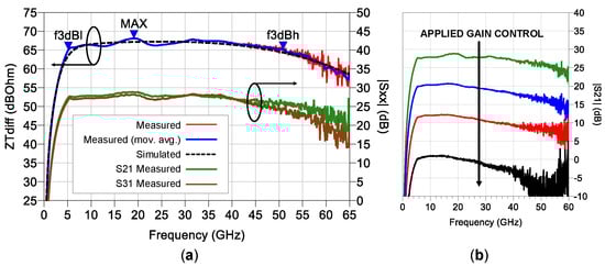 First, small signal performance of the chip was evaluated by on-wafer measurements using a 2-port vector network analyzer (VNA). All measurements were performed with a supply voltage of 3.3 V, with the circuit drawing around 69 mA for a total DC power consumption of around 228 mW. The output power from the VNA was set to −40 dBm to ensure linear operation at maximum gain. Figure 7a shows the measured forward S-parameters for each of the differential TIA outputs ( and ). In each case, the unused TIA output is DC blocked and terminated in a 50 load. The differential transimpedance response was obtained from the measured S-parameters, and is plotted in the figure together with the simulated response. For the simulated transimpedance, RC parasitic extraction of the amplifier core was combined with electromagnetic simulation of input and output structures and peaking inductors. Excellent agreement between measurement and simulation is observed. Lower and higher 3 dB cut-off frequencies (measured relative to the maximum transimpedance value of 68 dB) of 5 and 50 GHz, respectively, are obtained using a moving average (1 GHz wide) on the measured data. This was done in order to better illustrate the amplifier response towards the higher frequency end, where setup limitations lead to excess noise in the measurements. Figure 7b shows the behavior of the gain control functionality in the S-parameter response for one of the TIA outputs, where the possibility for gain reduction down to around 0 dB is demonstrated.