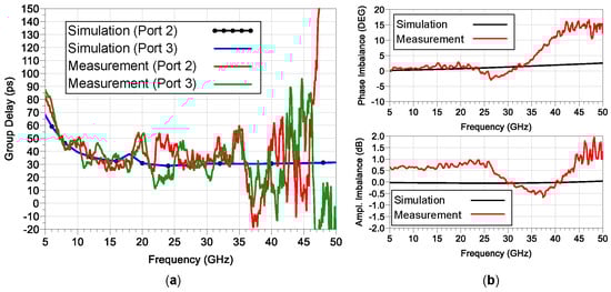 Figure 8a shows the simulated and measured group delay response. A moving average (2 GHz wide) was applied to the measurements to better illustrate the trend. The measured group delay variation closely follows the trend of the simulated response up to 35 GHz. Above this value, larger deviations are observed from the simulations. Figure 8b shows the amplitude and phase imbalance between the two TIA outputs. Good agreement is obtained for the phase imbalance up to 35 GHz. Above this frequency, the measured response also deviates from the simulation. This deviation from the simulated response in the phase measurements was mainly attributed to the limited accuracy of the setup, where excessive noise due the low input power used in the measurements can compromise the highly sensitive phase response. The amplitude imbalance remains within ±1 dB up to 45 GHz. A 0.5 dB difference between the two outputs is observed already at low frequencies, which falls within the repeatability of the measurements, since the two outputs must be measured independently using a 2-port VNA.