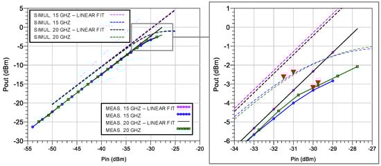Measured and simulated 1 dB compression point at 15 and 20 GHz. Linear fits are provided together with markers identifying the 1 dB compression. The magnified view on the right side provides a detailed view around the 1 dB compression points.